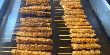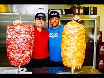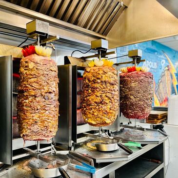 Top quality lamb, pork and chicken from Americas best meat suppliers, filleted and marinated with spices and sauces according to customary family recipes and layered one by one for roasting on a conventional vertical spit. The fat drains for a leaner cut while constant basting enhances the tantaliz